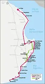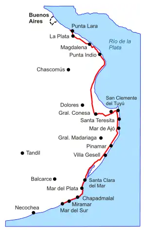 Major citiesPunta Lara, La Plata, Magdalena, Punta Indio, Gral. Conesa, General Lavalle, San Clemente del Tuyú, Santa Teresita, Buenos Aires, San Bernardo, Mar de Ajó, Cariló, Pinamar, Villa Gesell, Santa Clara del Mar, Mar del Plata, Chapadmalal, Miramar