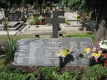 Following the massacre, the victims were buried in a mass grave in a local cemetery.[5] Polish newspapers also note that two more civilians were killed in the summer of that year, after the end of the war, when Red Army troops were returning from Germany. A man was strafed by a Soviet plane in June, and a woman killed in July by a group of Soviet soldiers stealing a cow.[1][4] During the years of Communist rule in Poland (which lasted until 1989), factual knowledge of these events was censored by the communist government,[5] and the mass grave was kept anonymous.[3] It was not until the 60th anniversary of the event in 2005 that a memorial stone was erected at the cemetery.[3] The commemorative ceremony was performed by the bishop of Legnica, Stefan Cichy, who was personally an eye-witness to the events, as well as a relative of one of the victims.[1][3]