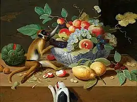 - 1 2 Pseudo Jan van Kessel II (active second half 17th century), Grapes, apples, peaches in a blue and white porcelain bowl, with strawberries in a broken porcelain bowl on a stone ledge, with a monkey; and Grapes and peaches in a basket on a raised stone ledge, with a melon, figs and a turtle at Christie's