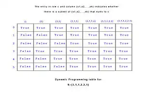 - p(i, j) is True if either p(i, j − 1) is True or if p(i − xj, j − 1) is True
