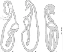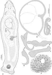 The sclerotized male copulatory organ, or "quadriloculate organ", has the shape of a bean with four internal chambers, as in other species of Pseudorhabdosynochus.[2] The vagina includes a sclerotized part, which is a complex structure, about 60 µm in length.