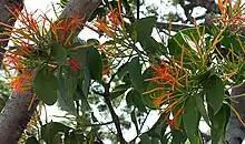 Psittacanthus calyculatus is hairless, with nearly terete branches.[3] The leaves are opposite and ovate or lanceolate, having almost no petiole, and without veins.[3] The inflorescences are terminal and in groups of three yellow to scarlet flowers which have cup-shaped bracts under them.[3]