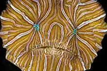 The coloring of the skin is a pattern of yellowish brown or peach colored stripes. This pattern covers the entire fish, including its fins, except for the hidden skin that is exposed when the lips are stretched forward, which is pale in color. At the margins, the skin can appear to be turquoise, although the exact nature of this coloration is unclear. Unlike some frogfishes, the psychedelic frogfish's color never changes, even if the habitat changes, and its offspring maintain that color as well.[1] The fingerprint pattern, like the stripes on a zebra or the spots on a humpback whale's tail, is unique to each individual. This allows researchers to easily track multiple psychedelic frogfish in the wild and still identify them from any angle.[3]