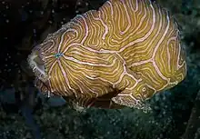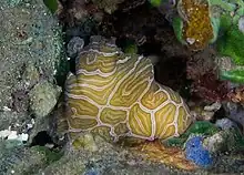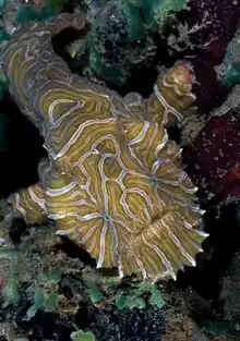 The psychedelic frogfish (Histiophryne psychedelica) is a yellow-brown or peach colored frogfish named for its pink and white stripes arranged in a fingerprint pattern. The fish is from waters near Ambon Island and Bali, Indonesia.[1]