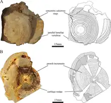 {{cite journal}}: Cite journal requires|journal=(help) - ↑ Hoffman, Brian L.; Hageman, Scott A.; Claycomb, Gregory D. (July 2016). "Scanning electron microscope examination of the dental enameloid of the Cretaceous durophagous shark Ptychodus supports neoselachian classification". Journal of Paleontology. 90 (4): 741–762. Bibcode:2016JPal...90..741H. doi:10.1017/jpa.2016.64. S2CID 132252846.