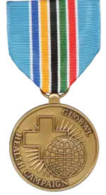 The Public Health Service Global Health Campaign Medal is a decoration of the United States Public Health Service presented to members of the United States Public Health Service Commissioned Officer Corps and to members of any Uniformed Services of the United States in recognition of an officer's substantial contribution to a Global Health initiative mission outside of the United States.