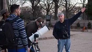 Man in Brooklyn's Prospect Park inviting passersby to use his telescope and talk about an astronomical phenomenon