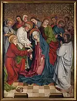 The paintings on the wings of the altar are influenced by Dutch naturalism (Dieric Bouts), evident in the careful drawing of small details, the portrait-like characterization of faces, and the realism of the time, which brings the depicted action into the viewer's present and interprets it as an actual story.[3] The characteristic features of the painting style are space depicted in the form of scenery flats, with an implausible perspective with multiple focal points, some naturalistic elements of vegetation and architecture, non-dramatic scenes, and cool colours rendered in large continuous areas. The light comes from a single source and the depth of the space is suggested, for example, by the cast shadow of a candle. The background is replaced by a gilded engraved ornament. The shapes are harder, with an emphasis on drawing, the sculptural volumes of the bodies and draperies are modelled with painting techniques. Underdrawing is visible in places. The inner sides of the retable are gilded and decorated with tin relief ornament imitating brocade, the outer sides are decorated with silver foil with a simpler geometric pattern.[4]