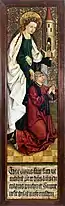 On the upper part of the rear side of the wings were pairs of saints. The surviving left wing shows the patron saint of the country, St. Ludmila, together with St. Ursula, who was popular in the hospital fraternity as a protector against the plague; the missing right part may have depicted St. Wenceslas. At the bottom of the rear side of the wing is St. Augustine teaching the Knights of the Cross, among whom is again the figure of Nikolaus Puchner. On the other wing is a scene of the stigmatization of St. Francis. The saint has a direct connection with St. Agnes as the founder of the Convent of Saint Agnes in Prague, and the apparition of the Holy Cross, carried by a seraph, refers to the Order of the Knights of the Cross. The composition comes from a graphic design by Monogrammist E.S.[6] The individual parts of the retable were complemented in the lower part by inscriptions, which have only partially survived.