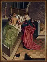 On the upper part of the left movable wing of the altar, St Agnes is depicted as a princess handing a model of the church to the first Grand Master of the Order, Albert of Sternberg. On the opposite side, St. Hedwig of Silesia is depicted wearing a ducal cap, nursing a sick man in bed. Hedwig was the wife of Prince Henry of Silesia and founded the hospital in Wrocław. Agnes was betrothed at the age of 3 to their son Konrad and the Knights Order had a branch monastery there. This painting has often been misunderstood as a depiction of St Agnes. In principle, there can be no doubt that this is St. Hedwig of Silesia - see the ducal cap and the fact that St. Agnes as a Poor Clare was not allowed to leave the cloister and treat the sick. At the bottom left is the Death of the Virgin Mary with the Last Prayer,[5] on the right the Crucifixion scene.