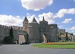 The gate is of Moorish origin, but the main part was built in 1559 by Alonso de Covarrubias.[1] It carries the coat of arms of the emperor Charles V. It superseded the Puerta Bisagra Antigua as the main entrance to the city.