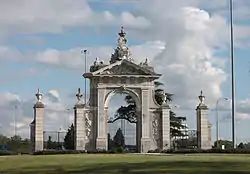 Puerta de Hierro (Spanish for Iron Gate) is a monument of the second half of the 18th century, located in the northwest of Madrid, Spain, in the district of Moncloa near the Monte de El Pardo. It occupies a landscaped traffic island, defined by several branches of the highway A-6 and M-30, an enclave which is difficult to access. It is built in classical Baroque style.