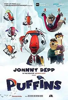Puffins is an animated television series targeted at children created by Danielle Maloni and Peter Nalli. It is a spin-off of the film Arctic Dogs (2019) and stars Johnny Depp. It follows five Puffins: Johnny Puff (Depp), Tic, Tac, Didi, and Pi who work for the wily walrus Otto. The show is produced by Iervolino Entertainment owned by Andrea Iervolino and Lady Monika Bacardi, and ILBE Studios based in Serbia. It consists of 250 episodes of five-minute episodes and was released on Apple TV and Amazon Prime Video in December 2020. A spin-off of Puffins, entitled Puffins Impossible, is slated for release and is to consist of 16 five-minute episodes with Depp to reprise his role as Puff.