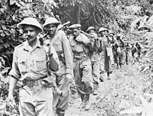 Men of a Punjab Regiment march out of the jungle near Pyagle, Burma, 1945.