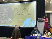 Belpré was born in Cidra, Puerto Rico.[3] There is some dispute as to the date of her birth which has been given as February 2, 1899, December 2, 1901 and February 2, 1903.[4][lower-alpha 1] Belpré graduated from Central High School in Santurce, Puerto Rico in 1919 and enrolled at the University of Puerto Rico in Río Piedras, where she originally planned on becoming a teacher.[5] But, in 1920, Belpré interrupted her studies to attend her sister Elisa's wedding in New York City, where she was recruited by a public library effort to hire young women from ethnically diverse backgrounds.[5] This first job led to an remarkable career that had Belpré travel the city, from the Bronx to the Lower East Side, telling stories in both English and Spanish, something that hadn't been done before. Belpré broke the barriers that led the Spanish speaking community to believe the library was "only English."[5] Except for brief interludes, Belpré remained in New York City for the rest of her life.