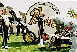 In 1907 the Purdue All-American Marching Band was the first marching band to break ranks and form a block letter on the field.[9] During the pregame show, the drum is positioned in the 'P' formed by the marching band and spins while the band plays "Hail Purdue!".