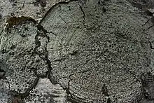 Pannaria 2.440 (subalpine forest at foot of Casablanca (volcano) in Puyehue) (note the black prothallus; this specimen peeled off the substrate readily in one piece, like an iron-on patch on a pair of jeans)