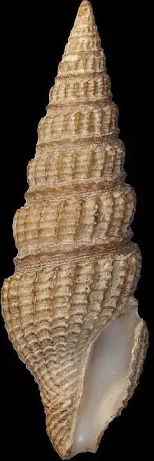 The shell is concavely, rather narrowly shouldered, with a thread-like raised line at the suture. It is closely longitudinally ribbed below the periphery and decussated by raised revolving lines. The color of the shell is dingy yellow to purplish black.[2]