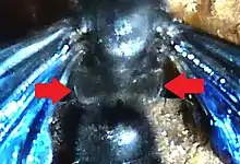 The forewings lack the second recurrent vein and third submarginal cell in both sexes. The wings are closely striolate apically, as with the Scoliidae generally, and feature strong blue, blue-green or golden-green effulgence.[2] The eyes are deeply notched, as with the family generally.[3] On the faces of females the front and frontal space (or spatium frontale, located between the antennae[4][5]) are separated by a distinct furrow, though not so in males. The male genitalia are distinctive.[2]
