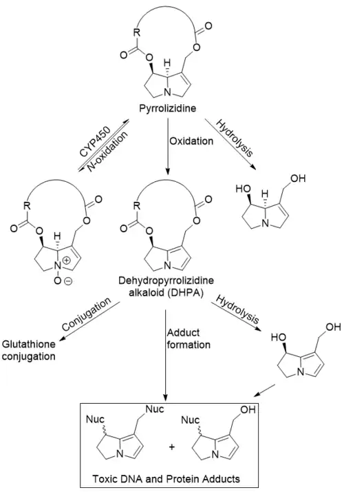 After oral ingestion, pyrrolizidine alkaloids are absorbed from the gastrointestinal tract. When they reach the liver, they are metabolized via three pathways: N-oxidation, oxidation, and ester hydrolysis. N-oxidation and hydrolysis are detoxification pathways, and the products of these reactions are conjugated and excreted by the kidneys. However, the N-oxide may be converted back into the pyrrolizidine by cytochrome P-450 (CYP450) monooxygenases. Oxidation of the pyrrolizidine to its respective dehydropyrrolizidine is responsible for the toxic effects.