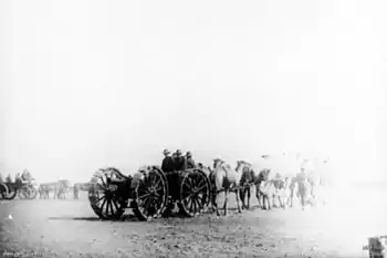 4.5-inch howitzers equipped British and Australian batteries in the Western Desert in 1940 and 1941, and Australian units in Syria.[17] Two guns that had decorated the main gate at Habbaniya aerodrome in Iraq were refurbished by the RAF and used by Habforce in the Anglo-Iraqi War in May 1941.[18] The batteries with the 4th and 5th Indian divisions went with them to East Africa and South African batteries with 4.5-inch howitzers also fought in this campaign.[19]