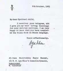 Aga Khan’s message to Hunzai, congratulating him on the completion of the "Ginan Book"