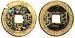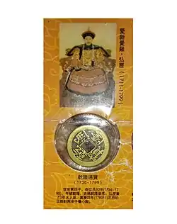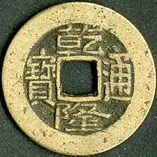 Ancestor coins (simplified Chinese: 祖钱; traditional Chinese: 祖錢; pinyin: zǔ qián) also known as engraved mother coins (Chinese: 雕母; pinyin: diāo mǔ) were introduced around 1730 during the Qianlong period in middle of the eighteenth century to improve the quality control of mother coins, these ancestor coins were used to cast more mother coins and from a single ancestor thousands of mother coins could be cast. The production process of making mother coins with ancestor coins was the same as it was for the casting of circulation coins from mother coins, however these coins were usually only produced for a new reign title, when preparing to cast new cash coins with new inscriptions for a recently ascended emperor, a mint would first engrave an ancestor coin out of fine brass which would form the basis for mother coins. The introduction of ancestor coins under the Manchu Qing dynasty lead to all mints having more consistently produced coinages and smaller variations between the coins produced by separate mints in both inscription (or legend) as well as in quality.[5][6][7][8][9][10]