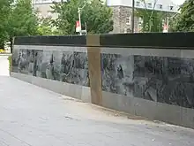The Ontario Veterans' Memorial was unveiled on 17 September 2006 and commemorates Ontarians who participated in a military campaign with the Canadian military from Canadian Confederation to the present.[21] The monument is 2.2 metres (7.2 ft) tall on both ends, although it slopes into a central gathering area.[21] The monument is a 30-metre-long (98 ft) granite wall with 44 images depicting Canada's military history etched into the 24 grey granite panels.[21] Conflicts depicted in these images includes the Fenian raids, North-West Rebellion, Second Boer War, First World War, Second World War, Korean War, and various peacekeeping and support operations during the Cold War, and war in Afghanistan.[21] The monument is topped-off by a 66-centimetre-wide (26 in) black granite.[21] A plaque situated next to the seating area provides a brief recount of Ontario's military history, from the War of 1812 to the war in Afghanistan.[22] The memorial was designed by Allan Harding Mackay and landscaping firm Phillips Farevaag Smallenberg; Ontarian-born historian Jack Granatstein wrote the historical text and choose the images, while Ontarian-born poet Jane Urquhart wrote the monumental inscription.[22]
