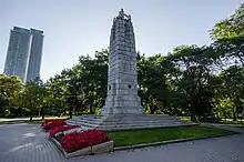 The park's first memorial was the Canadian Volunteer Monument.[note 3][8] Unveiled in 1870, it is the second oldest monument in Toronto.[19] Sculpted by Robert Reid, it was dedicated to Toronto residents that fought during the Battle of Ridgeway.[20] A second war memorial was erected in 1895, the Northwest Rebellion Monument. The monument commemorated members of the Canadian Militia and the North-West Mounted Police who fought during the North-West Rebellion.[12] Near the northern apex of Queen's Park is the 48th Highlanders of Canada Regimental Memorial, erected in 1923.[14] In 1940, the Mackenzie monument was unveiled, commemorating William Lyon Mackenzie, as well as the establishment of responsible government in the Province of Canada.[15] The monument and bust were sculpted by Walter Seymour Allward. In 1967, the government of Ontario unveiled the Post One Monument, commemorating the Canadian Centennial.[12]