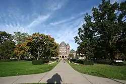 The cornerstone for one of the college's earliest buildings was laid at the site on 23 April 1842.[1] The building was built on the present site of the east wing of the Ontario Legislative Building, and was completed in 1843; although it remained vacant until 1845.[1] The building was initially planned to be the southeast wing for a larger building, although these additional wings were never built as a result of budget shortfalls.[1] The building was situated within a landscaped park surrounded by tree-lined avenues, and was accessed through two gates to the north and south.[10] While the university occupied the property it was known as University Park.[8]