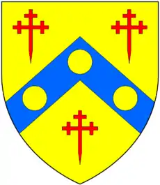 | Crossing:(?) A chevron between three cross crosslets (unknown). Apparently Crossing of Exeter, given similarly by Vivian as Or, on a chevron azure between three crosses crosslet fitchée gules as many bezants[39] which family was heir to the Dodderidge family of Barnstaple and of Bremridge, South Molton. Hugh Crossing was Mayor of Exeter in the 17th century[39] and his eldest son Francis Crossing (c.1598-1638) was Member of Parliament for Mitchell in 1626 and for Camelford in 1628.[40] | ||||