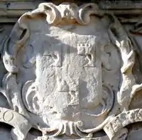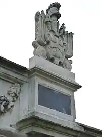 | Granville: Gules, three clarions or. For George Granville, 1st Baron Lansdowne of Bideford (1666-1735), nephew of John Granville, 1st Earl of Bath (1628–1701) and heir male of William Henry Granville, 3rd Earl of Bath (1692-1711).[45] It is the only escutcheon with heraldic supporters, generally reserved for use by nobility, here Two winged griffins rampant or. Above the escutcheon is a baron's coronet. He is identifiable by the style of his coronet and by his motto, shown inscribed on a scroll below: Deo, Patriae, Amicis[46] ("For God, my Country and Friends"), the motto of his uncle John Granville, 1st Earl of Bath having been: Futurum invisibile ("The future is unseen").[47] The arms are not those of John Granville, 1st Earl of Bath (1628–1701), or of his son Charles Granville, 2nd Earl of Bath (1661–1701). The latter's son William Granville, 3rd Earl of Bath (1692-1711) died aged only 19 two years before the building was completed in 1713. | ||||