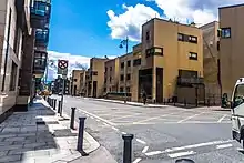 During the 1990s, schemes of flats were developed on Queen Street to infill houses which had been demolished for earlier road widening schemes. These were designed by Shay Cleary, and met with opposition from local politicians including Tony Gregory, who campaigned for houses to be built instead.[9] The scheme went ahead, was completed in 2003,[10] and also saw the development of existing corporation flats on the site.[11] By the early 21st century, large parts of the more commercial end of the street near the quays were used as furniture showrooms.[4]
