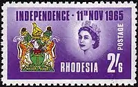 Southern Rhodesia had been a crown colony with responsible government since 1923 and the transfer from rule under the British South Africa Company. The monarch of the United Kingdom was automatically recognised as monarch in the colonies. Following the UK refusing to grant Southern Rhodesia independence under minority rule, on 11 November 1965, they unilaterally declared independence and declared Elizabeth II as the queen of Rhodesia.[1] The independence declaration clarified that they were only breaking from the British government and affirmed loyalty to Elizabeth, viewing her as the separate Rhodesian monarch as part of a "loyal rebellion".[2] All Rhodesian oaths continued to be taken to her and the declaration of independence ended with "God Save The Queen".[3]