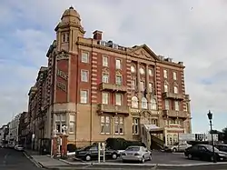 Queens Hotel is a luxury hotel in Southsea, Portsmouth, Hampshire. The current Queens Hotel is placed on the site of Southsea House, built in 1861 by architect Augustus Livesay, which was built for Sir John and Lady Morris. In 1865, due to boom in construction and tourism, Southsea house was converted into the Queen's Hotel by William Kemp Junior. It was one of Portmouth's first hotels, and it focused on the leisure and relaxation for the upper class. At 4:20pm on 8 December 1901, a fire gutted the entire hotel, leaving only the two outer walls that face Osborne Road and Clarence Parade. On 11 December 1901, it was deemed safe to enter the site and two missing chambermaids were discovered, dead, due to being trapped by falling rubble in the basement. In early 1902, plans were submit by the hotel owner at the time, G. H. King, to rebuild the hotel to cover the original footprint. The new hotel was to be much grander and more purpose-built, to include 63 rooms for visitors, and 33 for staff. The architect of the rebuild was London based T.W. Cutler. He was to design the hotel in the Edwardian baroque style in brown terracotta. This was a rising popular style across the British Empire in 1901. Designs were grand and lavish and no expense was spared. The hotel had to be designed to make a statement. The book England describes the hotel as a "Magnificent Edwardian hotel overlooking the Common, with ornate stone-carved balconies and countless neoclassical decorative flourishes".[1] The hotel contains 74 rooms and has two bars and a restaurant.