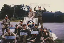 Personnel of the 359th Fighter Group with the insignia of the 370th Fighter Squadron and signage that has been taken down at East Wretham during the V-E Day celebration, 7 May 1945