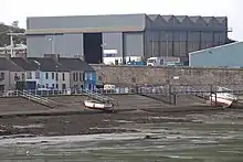 The two large 'B' type hangars have survived and are now both listed buildings.[51][52] Other parts of the dockyard, such as the spillways have been lost in the reconstruction of the dock for the cross Irish Sea ferry to Rosslare.[53]
