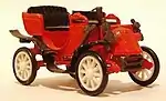 The majority of RAMI vehicles appeared in red boxes with a cream white 'illustration' section portraying the 1895 Panhard & Levassor open car on two sides. This illustration did not vary, box to box, so what was seen on the box was inside only with the Panhard & Levassor model. Above the Panhard illustration were the letters "RAMI" in white without punctuation. Boxes did, however, come in a few different sizes depending on the size of the model – some were more squarish and others more rectangular. The opposed sides from the illustration were stamped with the name and year of the individual model.[1] The end flaps likewise had the name of the particular model. Though some lists show the models numbered in order of release, neither boxes nor model bases carry numbers of any kind. They do say "1:43" scale. A few of the later offerings were available in clear plastic display cases.