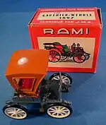 Early diecast collector Cecil Gibson noted the delightful features of RAMI models as early as 1971, pointing out the company's unique selection (from museum vehicles), delicate details (like spare tires and long brake and tiller levers) and whimsical features (as in 'mother-in-law' seats and parasol tops which do not cover the passengers.[5] Neither did RAMI shy away from odd body shapes – whether late 1800s boilers, curved boat-tails, spare wheel covers on roofs, or the varied folds and waves of landaulet covering material (in plastic or diecast metal.[6] Models often had combinations of vibrant colors, and appear much more striking in person than in photographs.