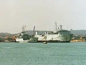 ![]() RFA Sir Caradoc alongside a smaller vessel at Marchwood Military Port in 1984 | |