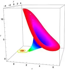 An example of chaotic behaviour is obtained for γ = 0.87 and α = 1.1 with initial conditions of (−1, 0, 0.5),[4] see trajectory on the right. The correlation dimension was found to be 2.19 ± 0.01.[5] The Lyapunov exponents, λ are approximately 0.1981, 0, −0.6581 and the Kaplan–Yorke dimension, DKY ≈ 2.3010[4]
