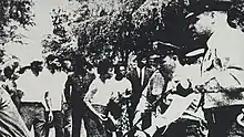 1963 was also the year of the Birmingham campaign in the Civil Rights Movement. Americans were shocked by a photo-essay published in Life magazine that showed young black protesters being fire-hosed and set upon by police dogs.[5] These Life photographs were by Charles Moore, and the then president John F. Kennedy was to say of them, and of similar images by civil rights photographers of the time, that the events they depicted were "so much more eloquently reported by the news camera than by any number of explanatory words".[6] Three of Moore's photographs were of a dog attacking a black man and although the theme was not strictly "Death", Warhol was sufficiently aware of their power to want to include them in his exhibition, consistent with his aim of showing the dark underside of the American Dream: "My show in Paris is going to be called 'Death in America.' I'll show the electric-chair pictures and the dogs in Birmingham and car wrecks and some suicide pictures."[1][3] In all Warhol made some ten silkscreen painting on the theme. They became known as his Race Riot paintings (counterfactually, in reality the images were of a peaceful march disrupted by police), and they represent Warhol's only overtly political statement, although he himself insisted that Moore's photographs had merely "caught his eye".[1]