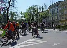 During the German invasion of Poland, which started World War II, the Einsatzgruppe I entered the town on September 4, 1939, to commit atrocities against Poles.[13] In September 1939, the Germans confiscated assets of the local Polish bank, and carried out mass arrests of prominent Poles, including the chairman of the local "Sokół" Polish Gymnastic Society, the editor-in-chief of local Polish newspaper Dziennik Raciborski, the chairman of the local Polish bank and activists of the Association of Polish Women.[14] During the war, the Germans operated a Nazi prison,[15] a Polenlager forced labour camp for Poles,[16] a forced labour camp for Jews,[17] and six labour subcamps of the Stalag VIII-B/344 prisoner-of-war camp in the town, and three labour subcamps of Stalag VIII-B/344 in the present-day district of Brzezie.[18] In 1945, the Germans sent 176 prisoners of the Nazi prison on a death march to Kłodzko,[19] and two German-conducted death marches of prisoners of the Auschwitz concentration camp and its subcamps passed through the town towards the Gross-Rosen concentration camp and Opava.[20] In the final stages of the war, it was initially spared by the Red Army Vistula–Oder Offensive but occupied and devastated on 30 March 1945. After end of the war, in June 1945, the army of Czechoslovakia briefly entered into the town and Czechoslovakia officially claimed the area of Racibórz and Głubczyce (Ratibořsko and Hlubčicko) because of having a substantial Czech minority (see border conflicts between Poland and Czechoslovakia). At the same time the expulsion of Germans started, while the town became wholly part of Poland as defined at the Potsdam Conference. The German CDU politician Herbert Hupka at the end of his life promoted reconciliation between the former German inhabitants, including himself, and the new Polish settlers and administration of Racibórz. In 1997, a flood devastated the town.