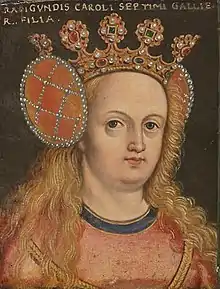 Radegonde of Valois (born in Chinon in 1425/August 1428 and died in Tours on 19 March 1445) was a French princess, eldest daughter of King Charles VII of France and Marie of Anjou. She was betrothed to Sigismund, Archduke of Austria.