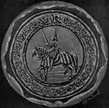 Ragnall is the only member of the meic Somairle known to have styled himself in documents rex insularum.[64][note 7] His use of both the title and seal are probably derived from those of the leading members of the Crovan dynasty, such as his namesake Rǫgnvaldr, who not only bore the same title but was said to have borne a similar two-sided seal.[65] The descriptions of the cousins' seals shows that these devices combined the imagery of a Norse-Gaelic galley and an Anglo-French knight. The maritime imagery probably symbolised the power of a ruler of an island-kingdom, and the equestrian imagery appears to have symbolised feudal society, in which the cult of knighthood had reached its peak in the twelfth and early thirteenth centuries.[66] The use of such seals by leading Norse-Gaelic lords, seated on the periphery of the kingdoms of Scotland and England, probably illustrates their desire to present themselves as up-to-date and modern to their contemporaries in Anglo-French society.[67]