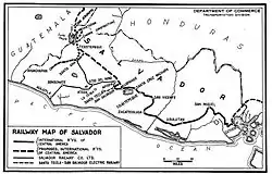 The first railroad in El Salvador was opened between Sonsonate and the port of Acajutla on June 4, 1882, by the British private company The Salvador Railway Construction Co. The first locomotives were American Tai models, built in England.[2] In the following years, the lines extended to Santa Ana, San Salvador and other places. Parts of network were managed separately by The Salvador Railway Company Limited (later nationalized and renamed FES - Ferrocarril de El Salvador) and IRCA - International Railways of Central America (a United Fruit company, later nationalized and renamed FENASAL - Ferrocarril Nacional de El Salvador). In 1975, based on a governmental decree, the two companies merged into FENADESAL - Ferrocarriles Nacionales de El Salvador, managed and administered by CEPA (port authority) on behalf of the state.[3]
