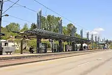 Rainier Beach station consists of a single, at-grade island platform in the median of Martin Luther King Jr. Way South on the south side of South Henderson Street. The station has a single entrance at Henderson, accessible via two crosswalks. A small plaza on the northeast corner of the intersection has seating, a bicycle locker with 34 spaces,[25] a bus stop, and public art.[26] Rainier Beach station, like others in the Rainier Valley, was designed by architecture firm Arai/Jackson.[27]
