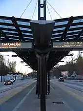 Rainier Beach station also houses six art installations as part of the "STart" program, which allocates a percentage of project construction funds to art projects to be used in stations.[29] At the station's detached plaza is Buster Simpson's Parable, a metal sculpture resembling sliced pears wrapped in metal wire; Simpson's piece is an allegorical commentary on the changing urban landscape of Seattle and the Rainier Valley, using recycled rails and rusted cast iron to form the major elements.[30] Darlene Nguyen-Ely's Dragonfly, an aluminum sculpture of a winged creature, is suspended above the station's lone entrance on Henderson Street; Dragonfly draws inspiration from the station's architectural elements and is meant to conjure the imagery of flight and wind.[31] Eugene Parnell's Increment on the station platform consists of four bronze columns with markings in relief representing systems of measurement used around the world as well as height comparisons with various animals. Three glass mosaics from Mauricio Robalino, Flores, Fishmobile and Pinwheel, decorate a nearby electrical substation with patterns inspired by Ecuadorian textiles.[32][33]