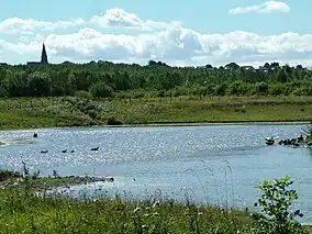 View from a bird hide of one of the ponds at Rainton Meadows Nature Reserve, County Durham. The church spire in the distance is St Mary's, West Rainton.