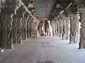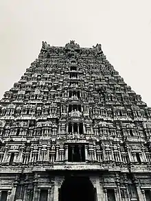 The originally temple was first constructed by Kulothunga Chola I(1070-1125 A.D.) stone inscription found in the site.[6] The place Mannargudi is termed Sri Rajathi Raja Chathurvedhi Mangalam[7] and the town started to grow around the temple. Successive kings of the Chola empire, Rajaraja Chola III, Rajendra Chola III and kings of Thanjavur Nayaks, Achyuta Deva Raya[8] expanded the temple. The temple contains inscriptions of the Hoysala kings and some Vijayanagara grants, and many records of the later Nayaks and Marathas.[9] The Thanjavur Nayaks made the temple as their dynastic and primary shrine and made significant additions.[10] The current temple structure, hall of 1000 pillars, main gopuram (temple gateway tower) and the big compound wall around the temple was built by the king Vijayaraghava Nayak(1532-1575 A.D.).[6] Raghunathabhyudayam, a doctrine by Nayaks explains the donation of an armour studded with precious stones to the main deity by the king.[8] He erected the big tower in the temple so that he can view the Srirangam Ranganathaswamy temple from the top of Mannargudi. The Nayaks were specially interested in music and it was promoted in both the temples. Instruments like Mukhavina, Dande, Kombu, Chandravalaya, Bheri and Nadhasvaram were commonly used in the temple service.[11]
